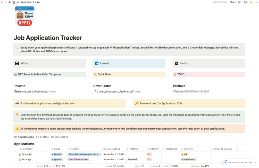 Introducing my Notion template for job application tracking! Whether you're a student looking for internships or a job seeker exploring new opportunities, this template is designed to streamline your job search process.